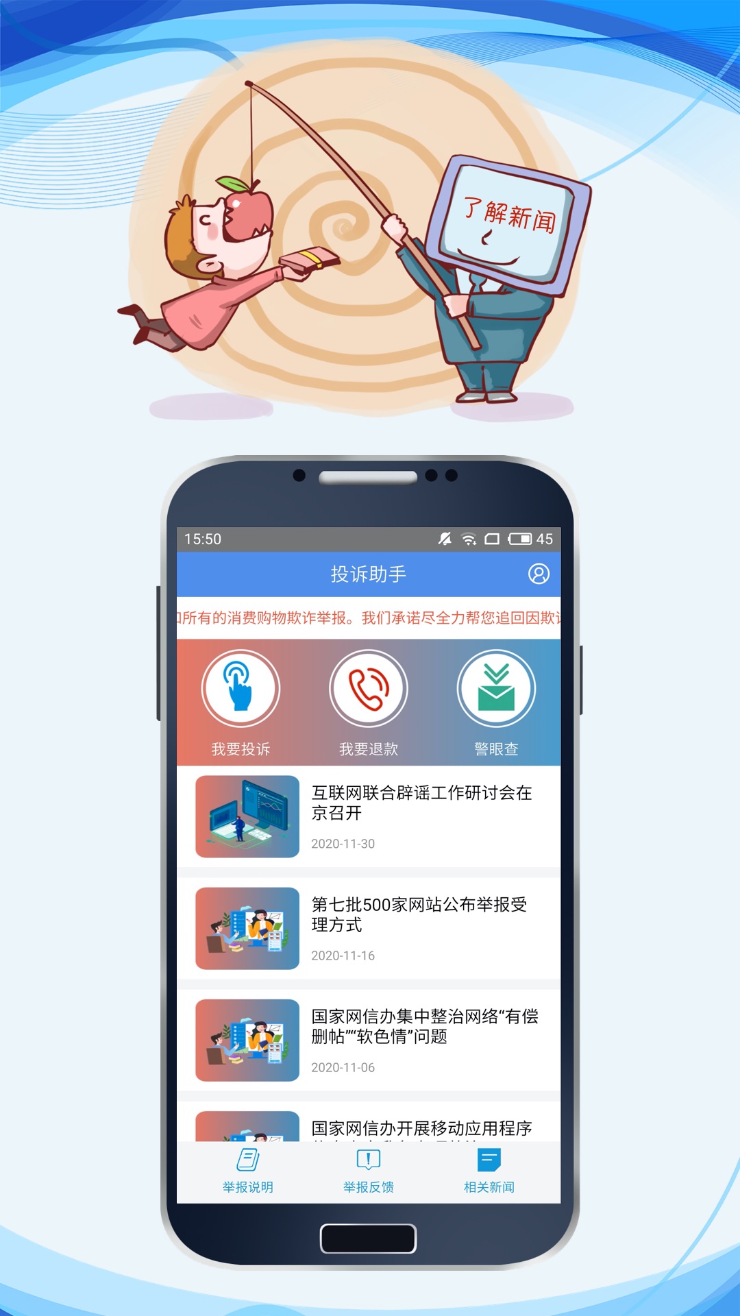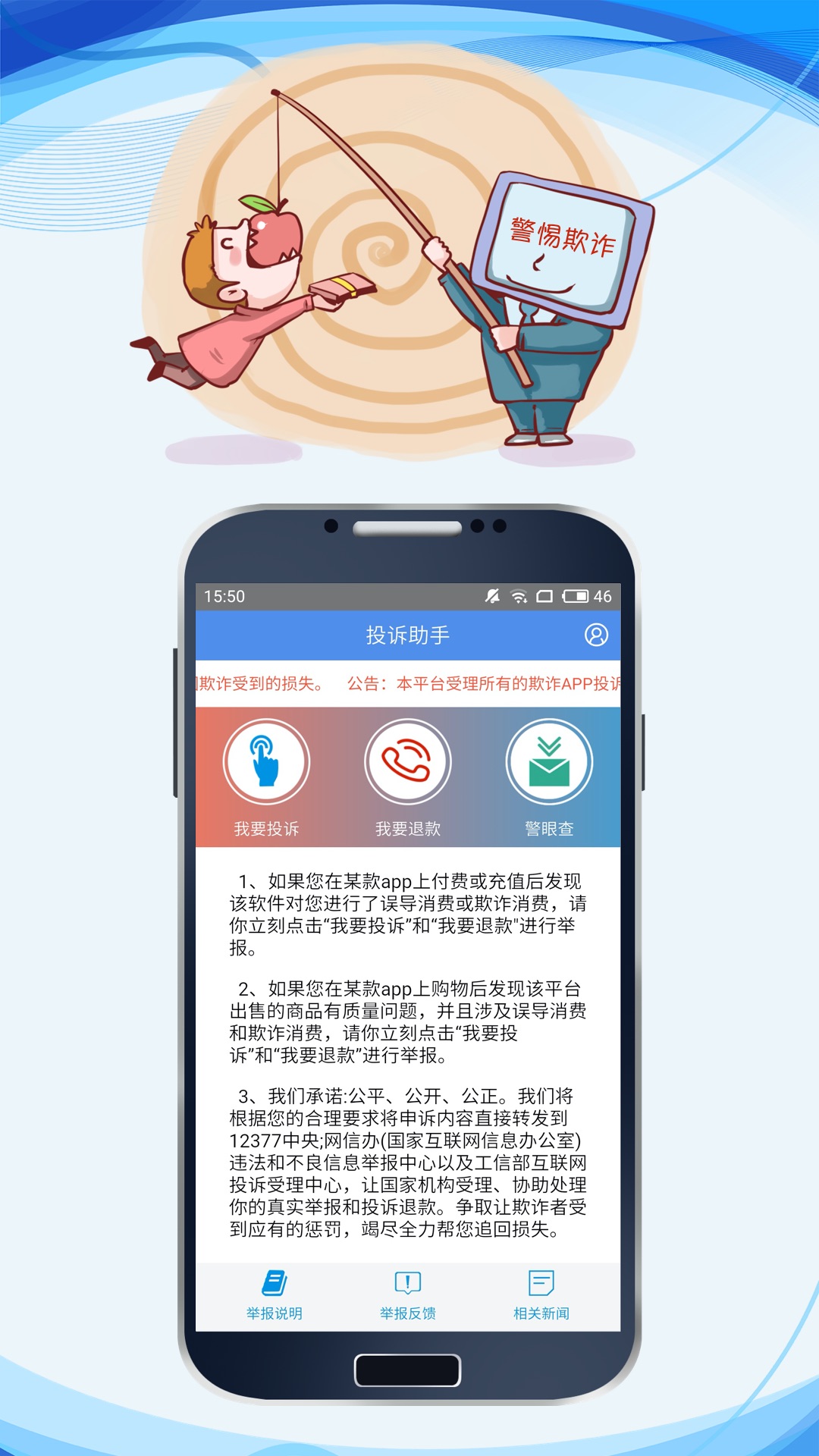 1、如果您在某款app上付费或充值后发现该软件对您进行了误导消费或欺诈消费,请你立刻下载我们软件进行投诉举报;